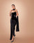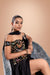 Skirt - A draped black skirt with soft pleats and an asymmetrical silhouette, featuring a thigh-high slit for graceful movement.