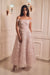A lavender off-shoulder gown with floral appliqué and crystal detailing, flowing gracefully with timeless charm. Designed for soirées, weddings, and modern celebrations.