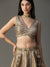 The lehenga in the image is STUNNING! 💃 It's a handpainted embroidery lehenga with a mix of elegance and contemporary vibes.The lehenga itself is in a shimmery beige or metallic gold colour with intricate handpainted embroidery at the bottom in shades of blue and maybe some silver accents. The blouse is a deep V-neck, metallic silver kinda thing that's totally show-stopping,Overall, this lehenga looks like it's made for a glamorous festive occasion
